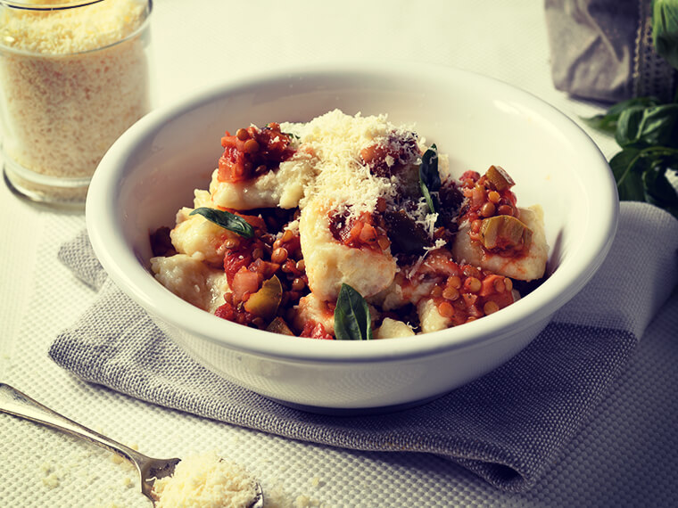 Gnocchi topped with chunky lentil sauce