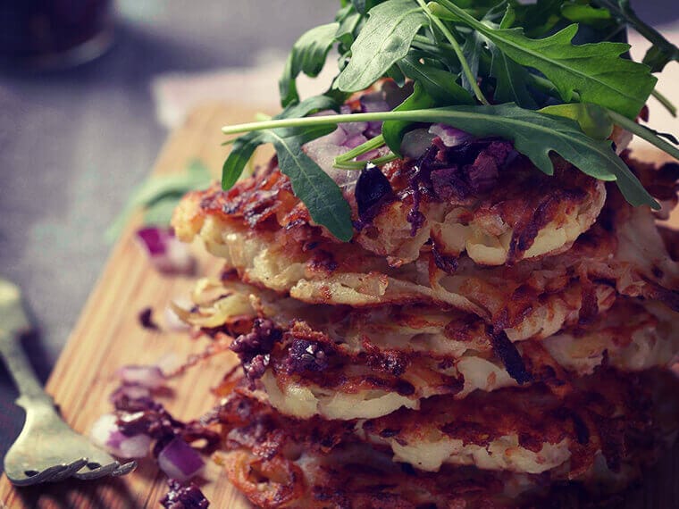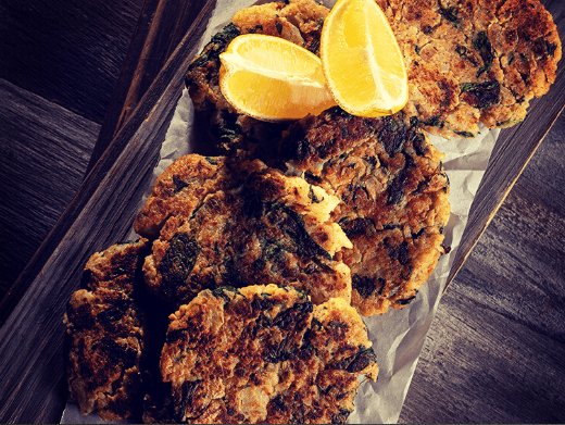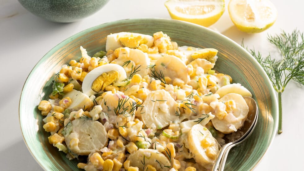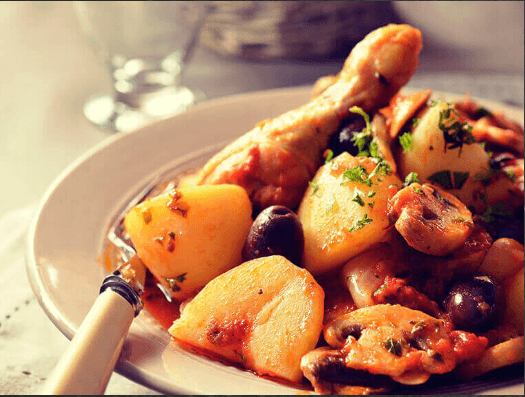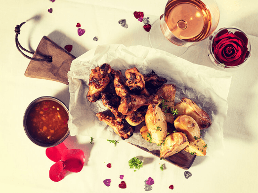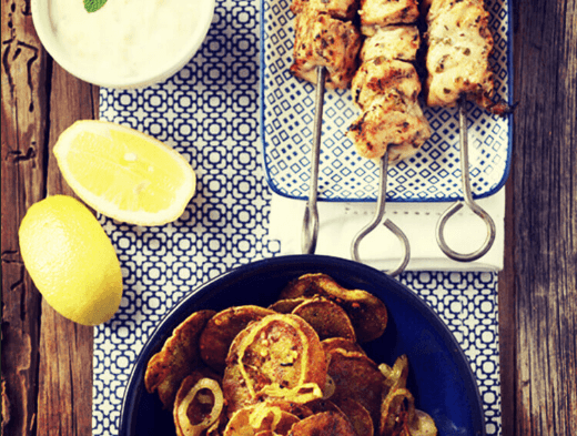 Chicken souvlaki served with spicy pan fried potatoes and drizzled with tzatziki